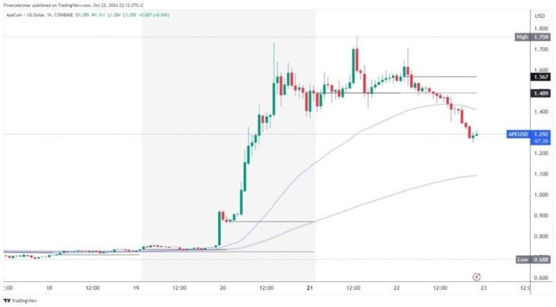 • The price of ApeCoin continued to move under bearish pressure to a new weekly low at 1,252 level