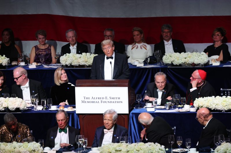 Trump’s appearance at the Al Smith Dinner was, in some ways, a reminder of his previous life in the New York elite as a real estate developer. (Trump was previously a registered Democrat.) During his speech, Trump spoke with nostalgia about attending the dinner with his father before he became a presidential candidate. He also recalled giving a check to Schumer. “I gave him his first check … and I was very proud of it, I don’t know about lately,” he said to laughs. “He was running and I said he’s a good man.”